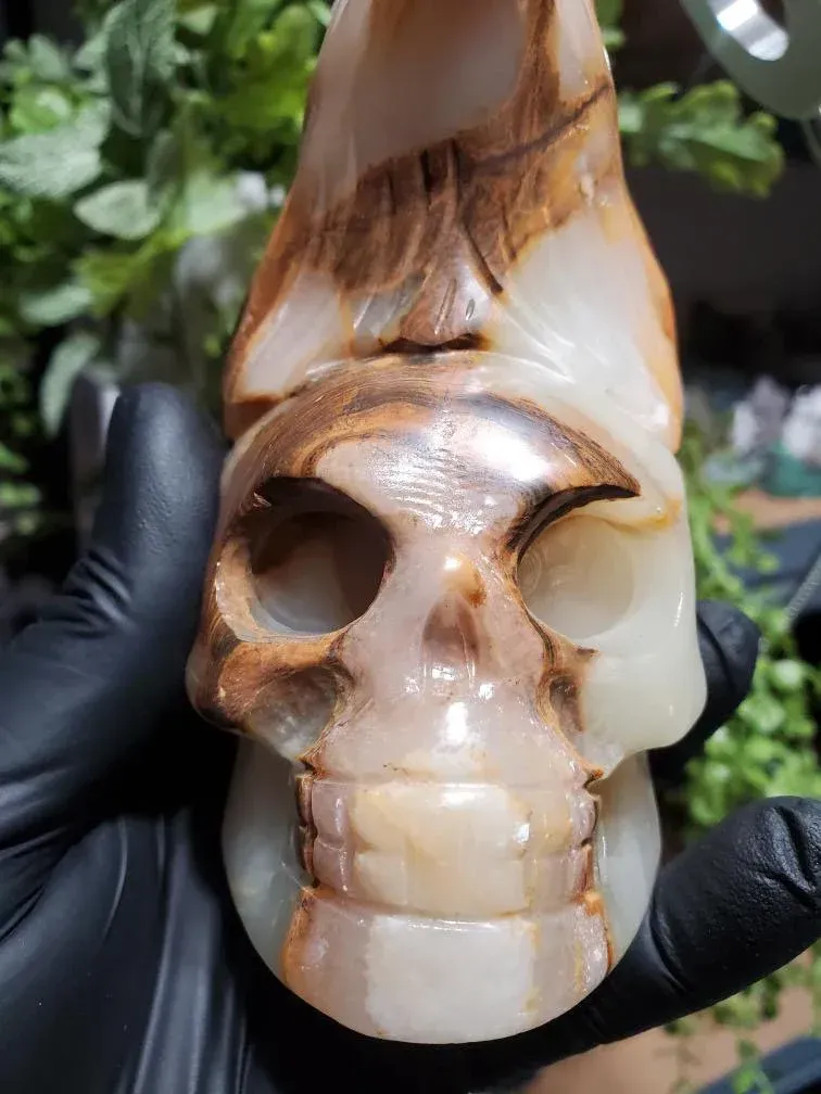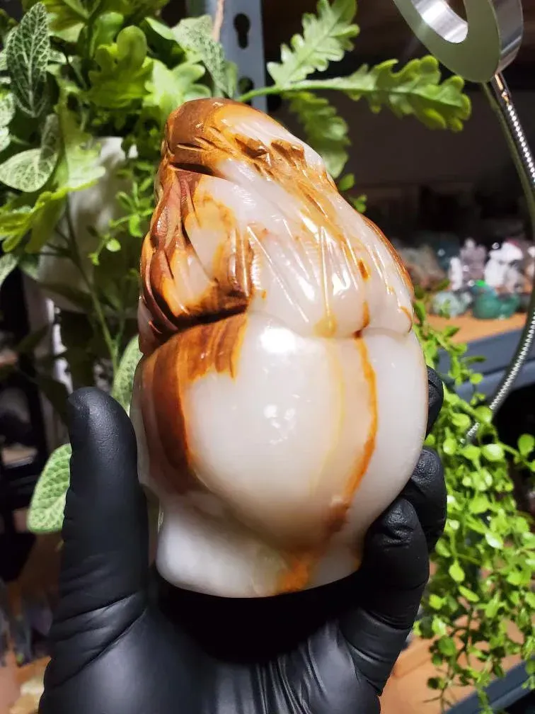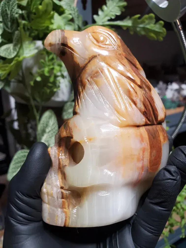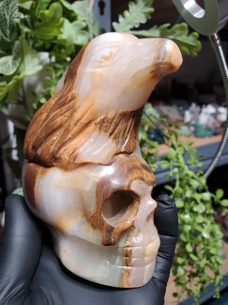 This stunning 754-gram Afghanistan “jade” crystal carving is a striking collectible featuring a powerful fusion of a human skull and an eagle head, symbolizing wisdom, protection, and transformation. Expertly hand-carved from richly patterned Afghan stone, it showcases beautiful natural tones and smooth polish, making it an eye-catching centerpiece for any crystal, art, or décor collection. Its substantial weight and detailed craftsmanship give it a bold presence, perfect for display, metaphysical use, or gifting to collectors who appreciate unique, meaningful carvings. A rare and dramatic piece—sure to stand out wherever it’s placed.