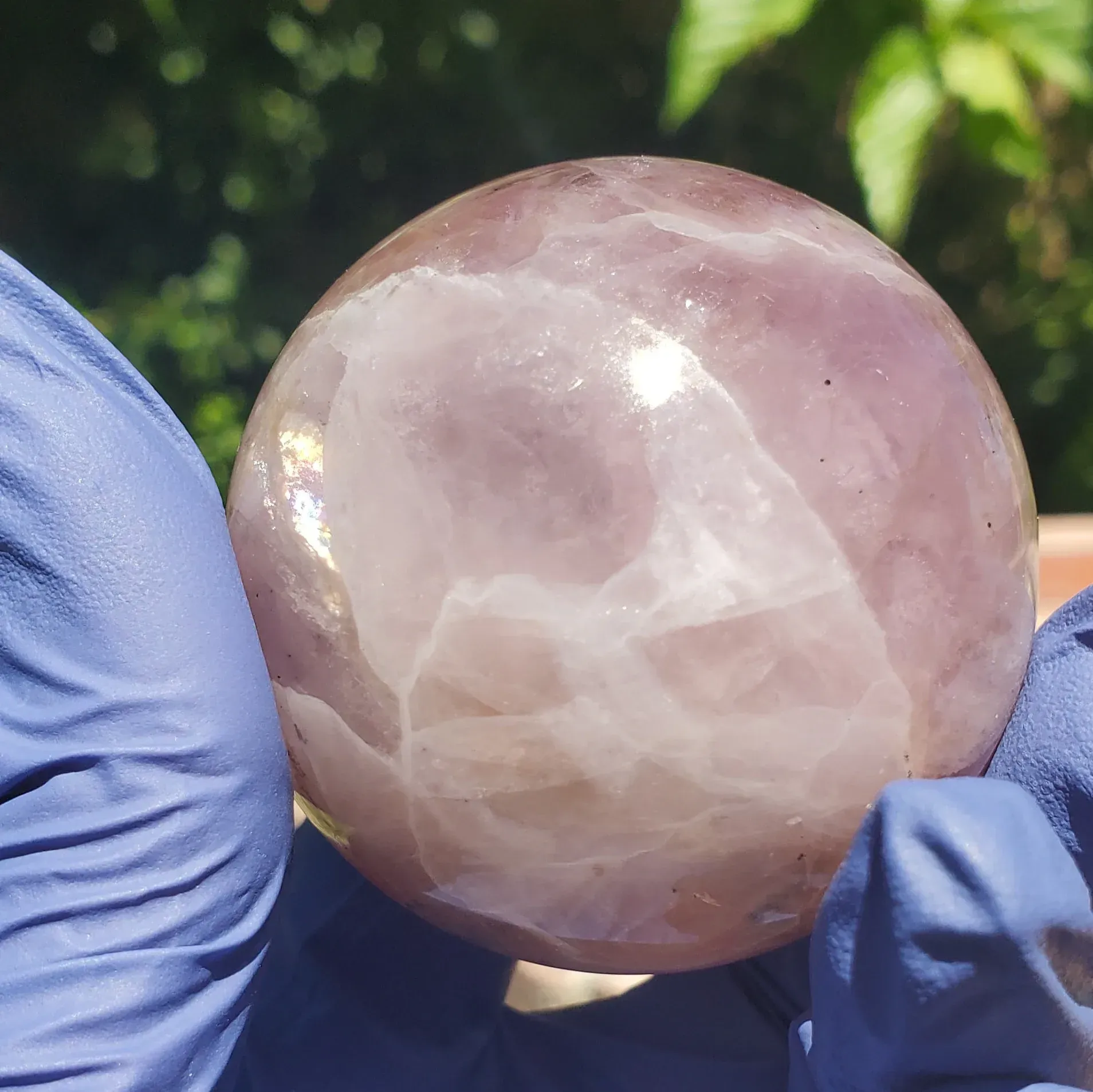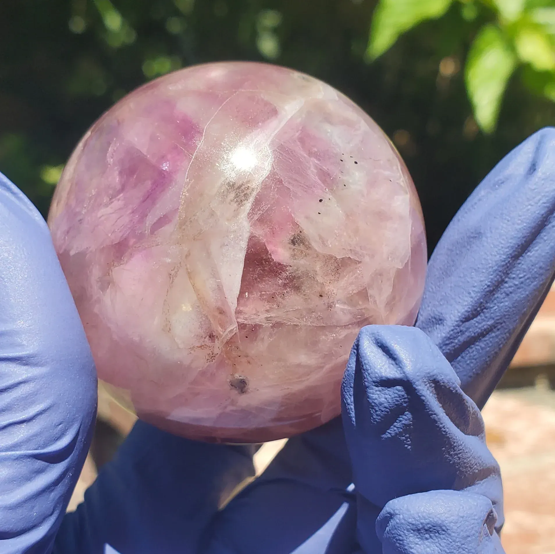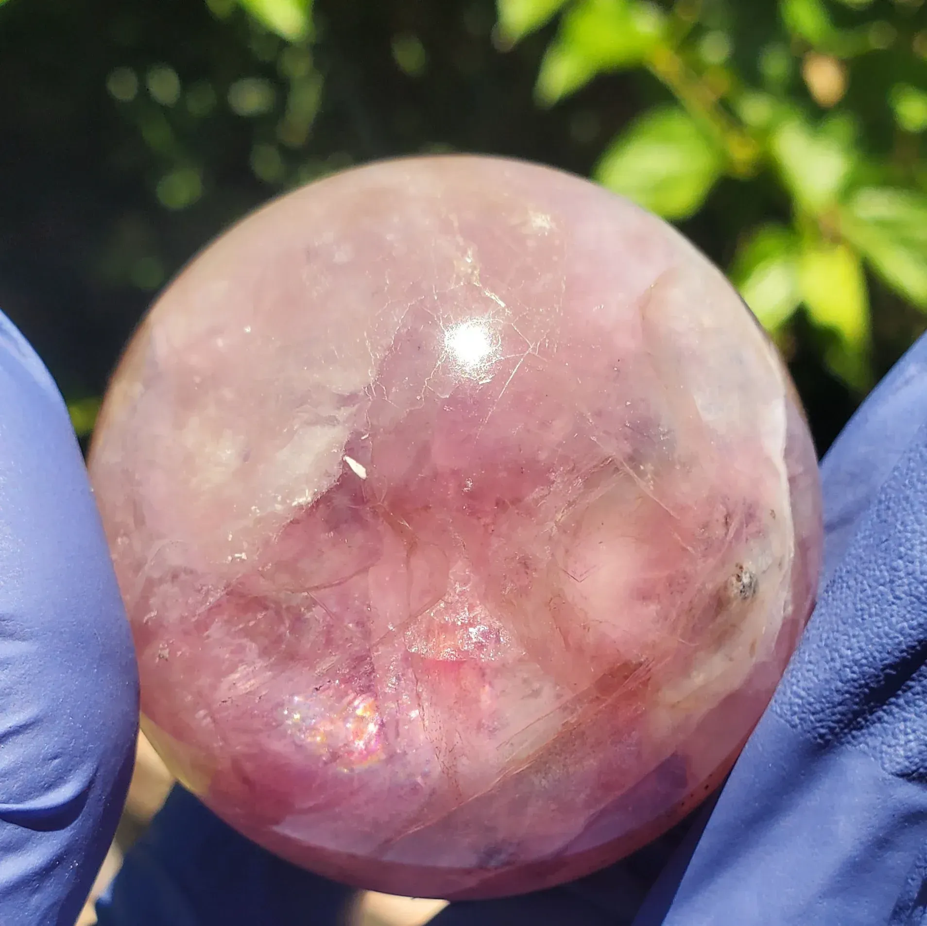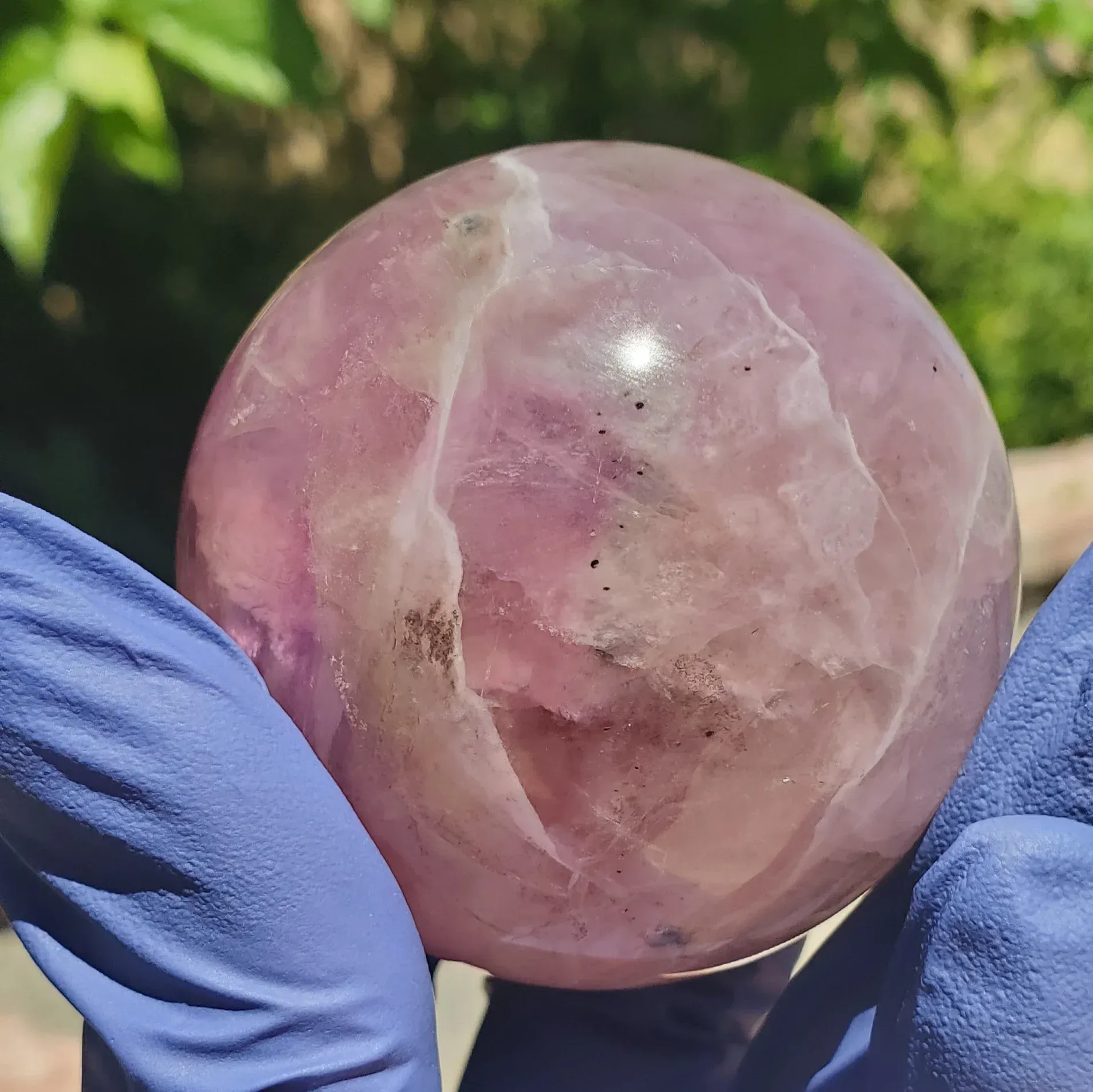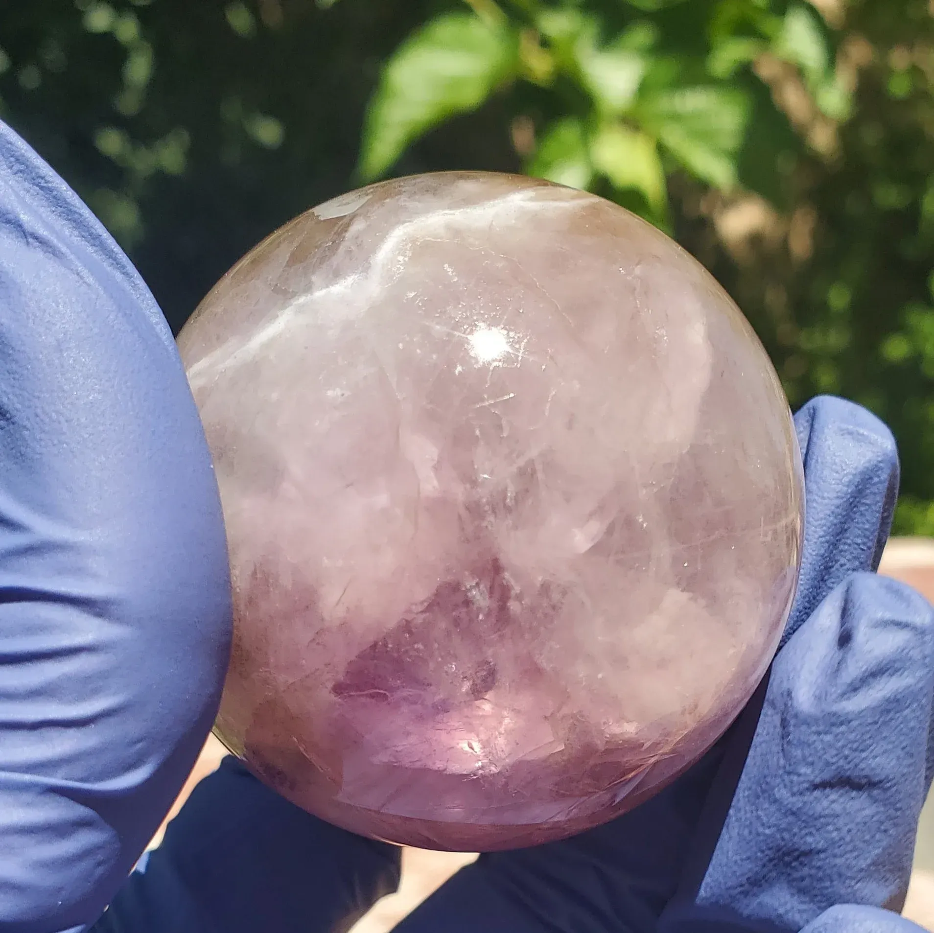 Purple fluorite sphere with a banding smokey white mixture and a bit iron and rainbow inclusions 234g