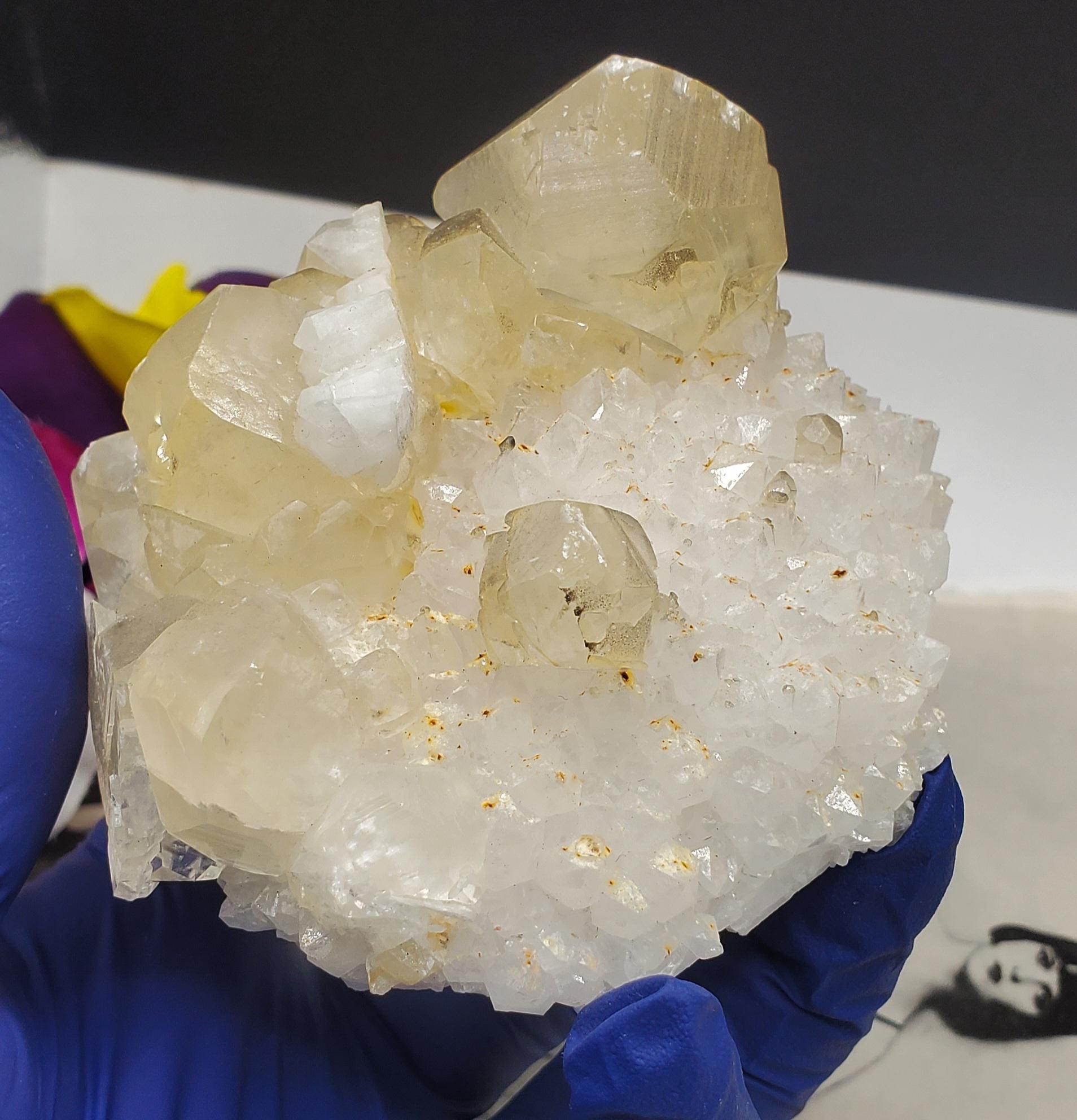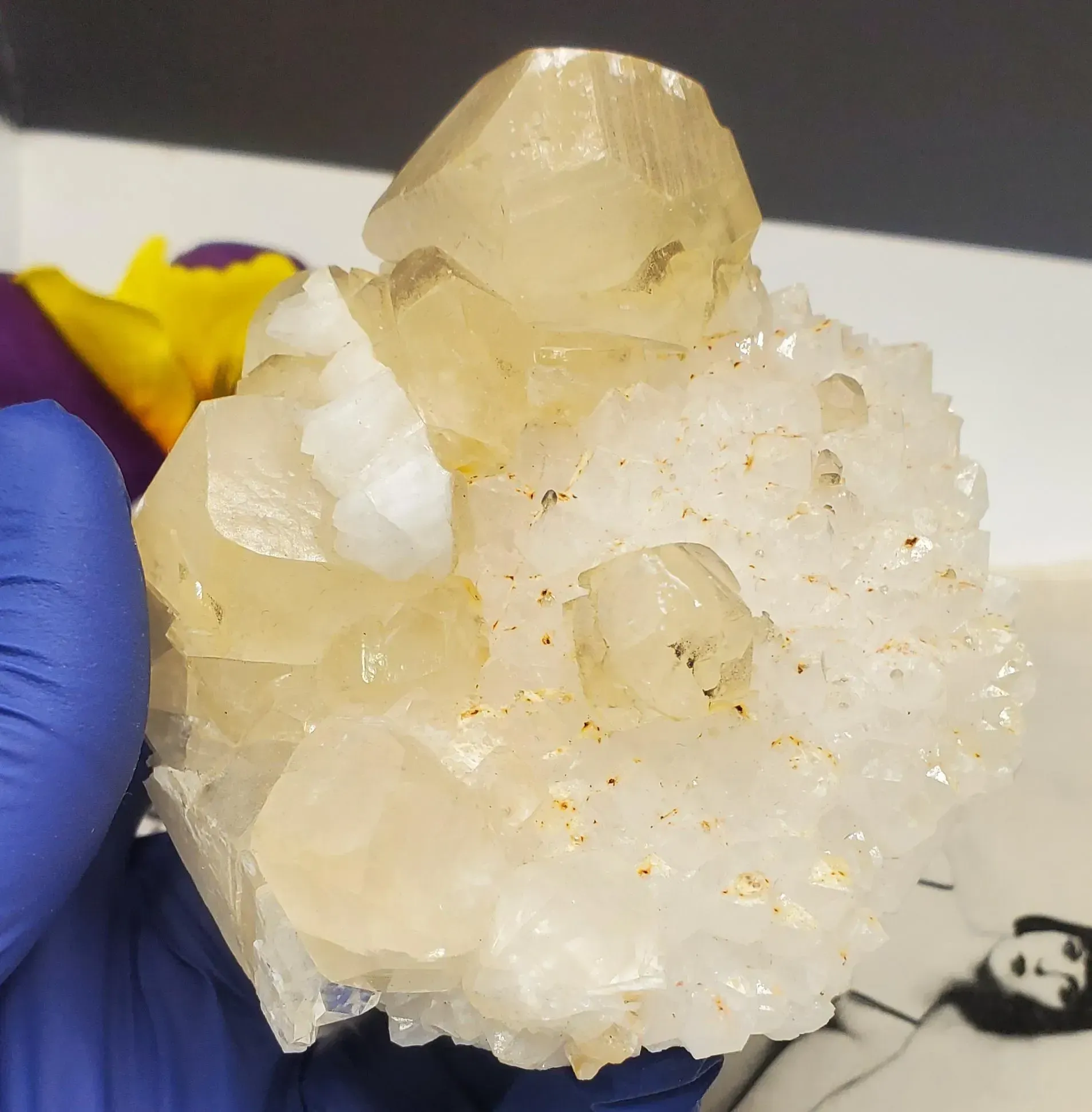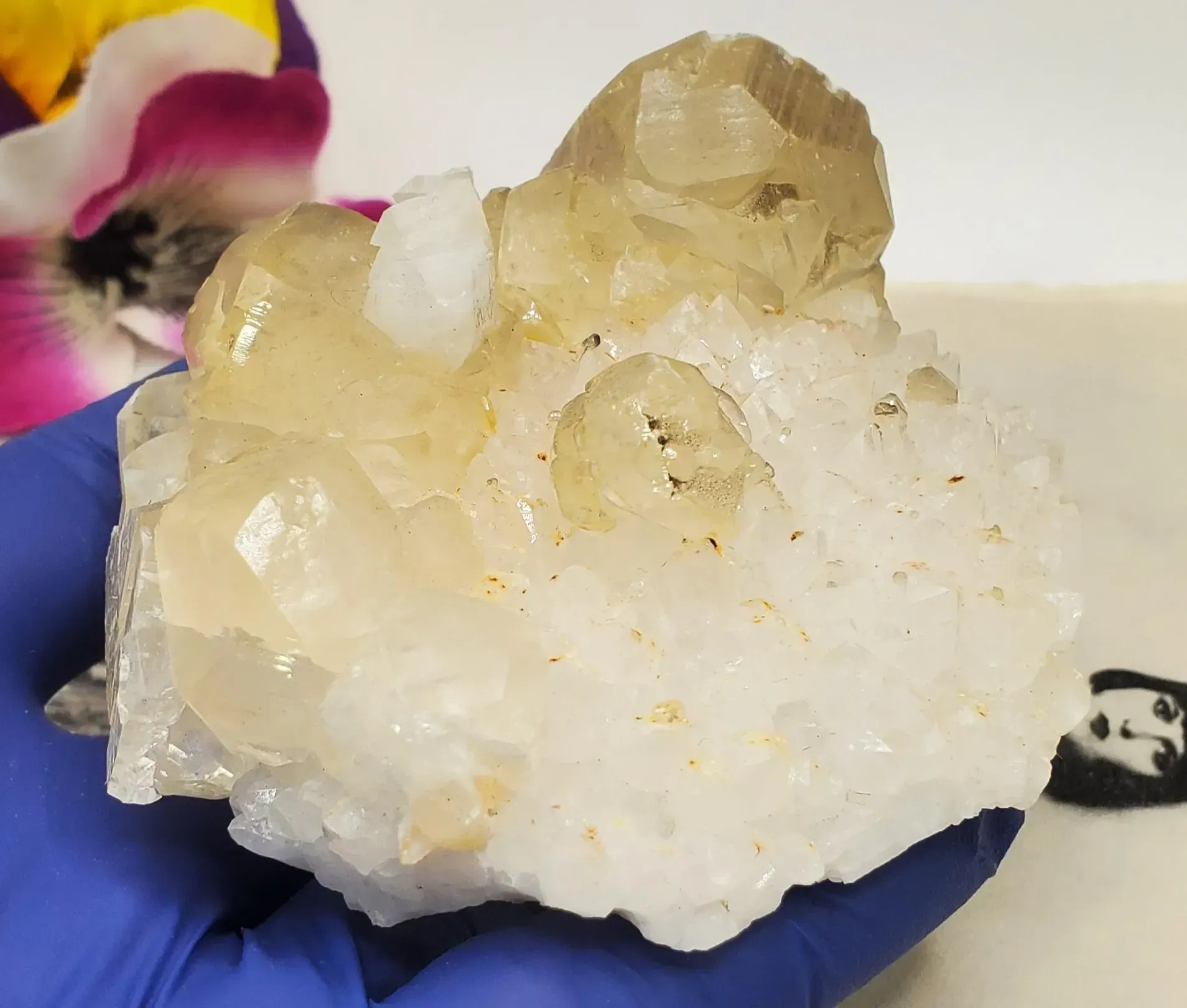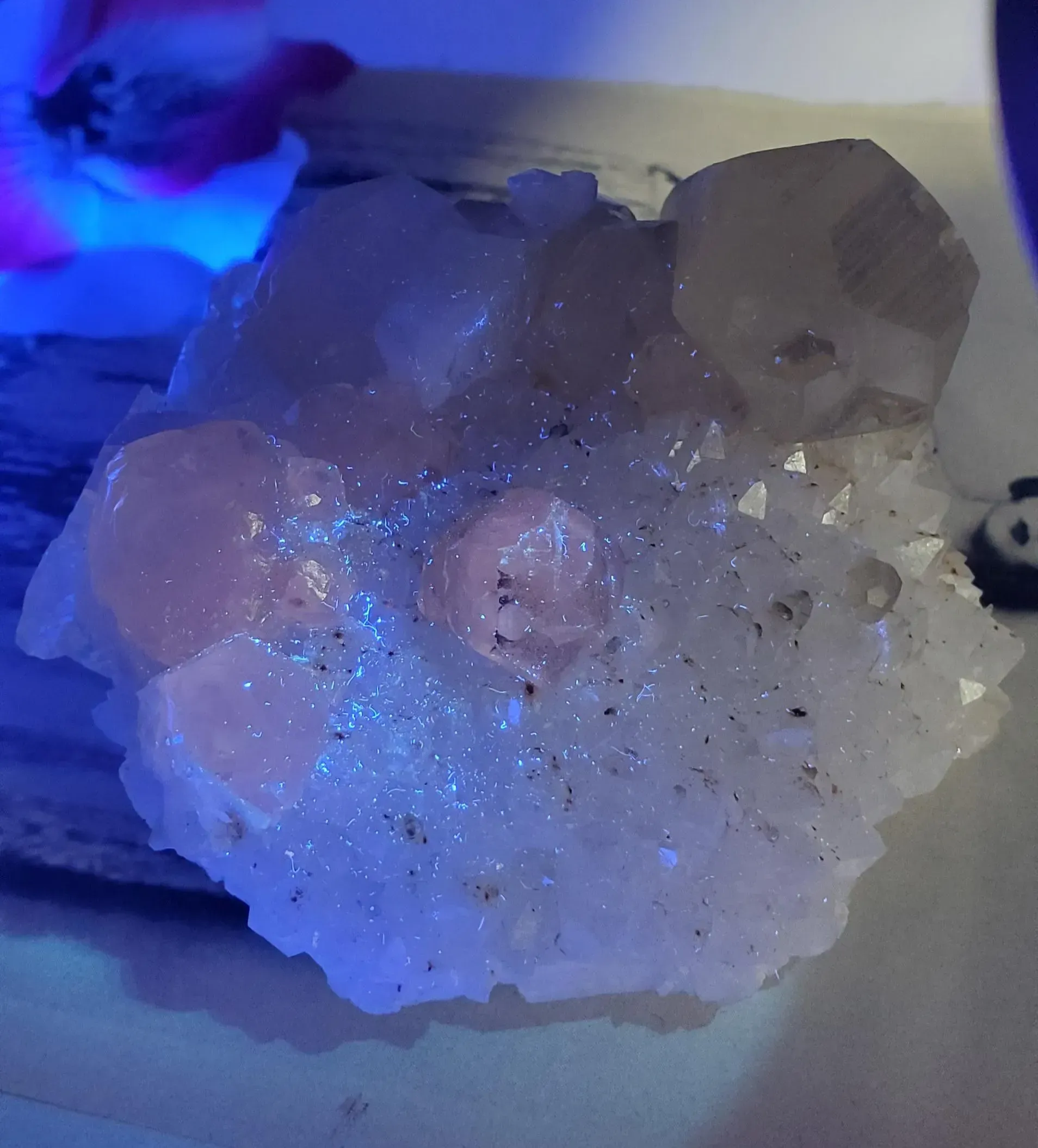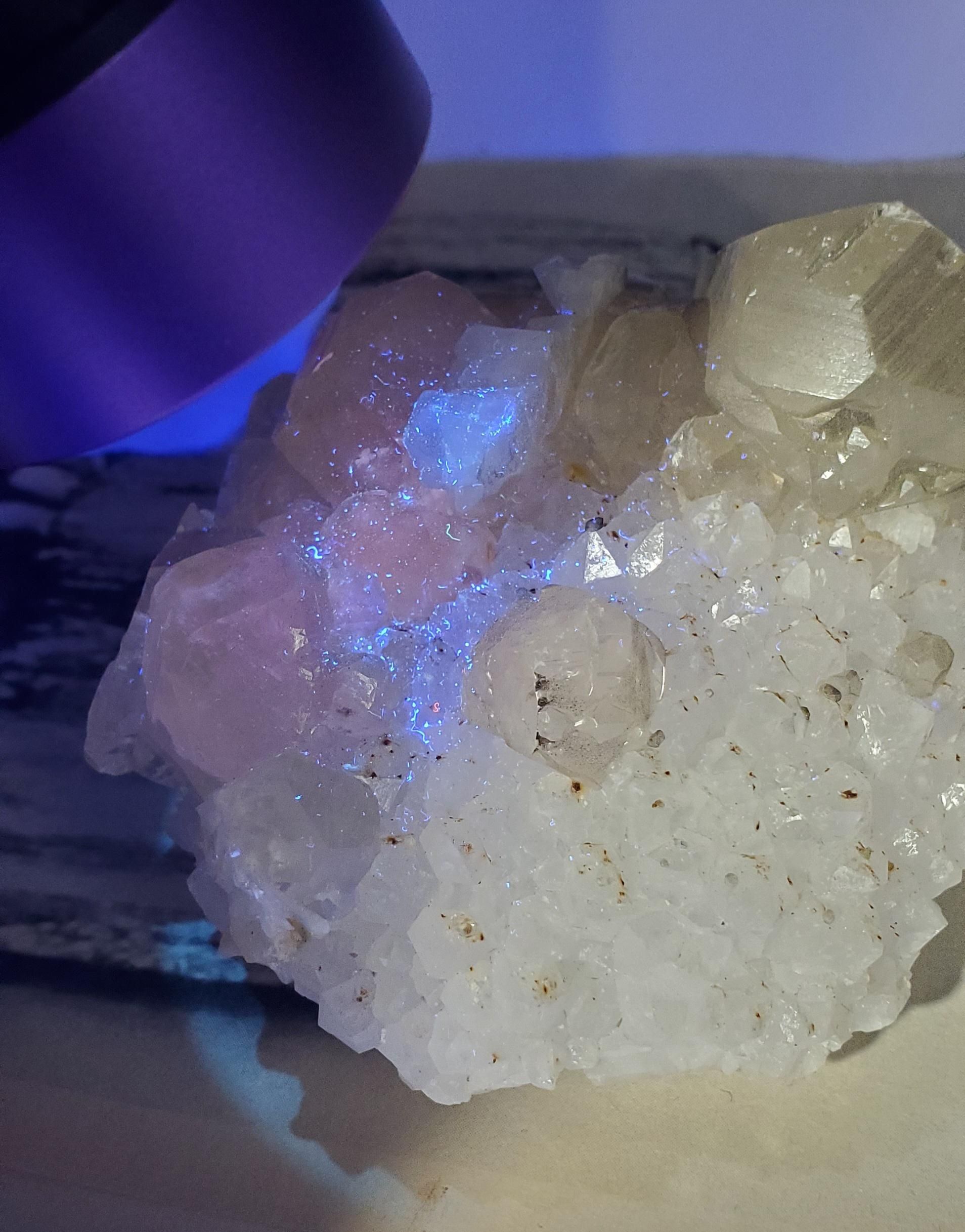 Golden Calcite on Quartz 272g from Fujian, Mineral Specimen healing cluster with pink UV reaction