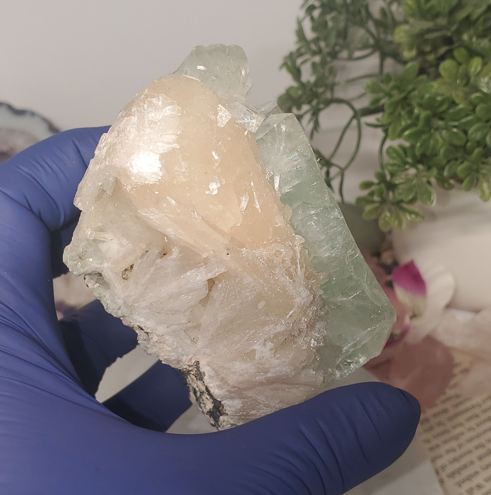 The specimen features transparent, mint-green apophyllite found alongside soft pale peach-colored stilbite
