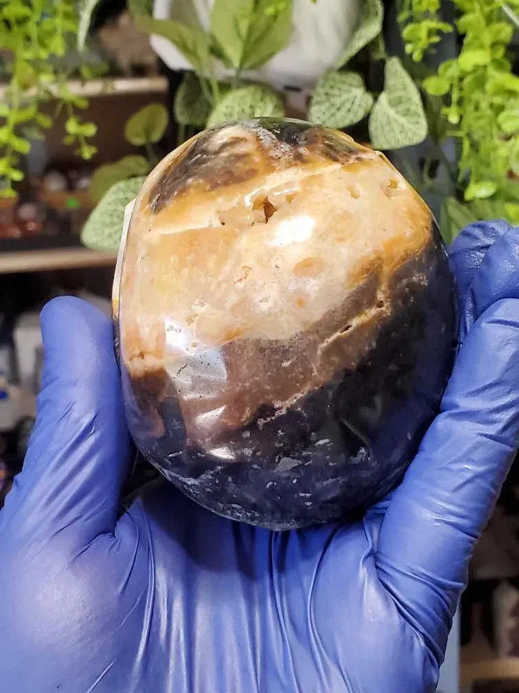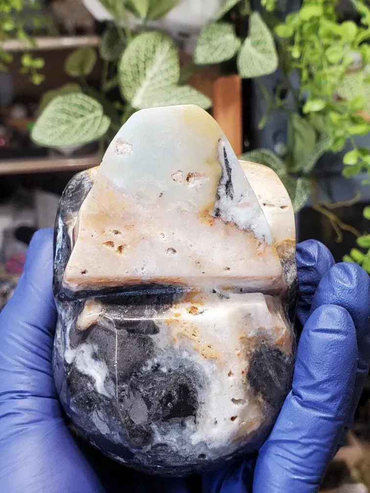 This stone features a mesmerizing blend of soft aqua blue calcite, creamy white calcite, and touches of light brown or sandy aragonite. The natural banding and wave-like patterns resemble gentle ocean tides rolling over sunlit shores. Each piece is completely unique, with layers that seem to hold the serenity of sea, sky, and sand.