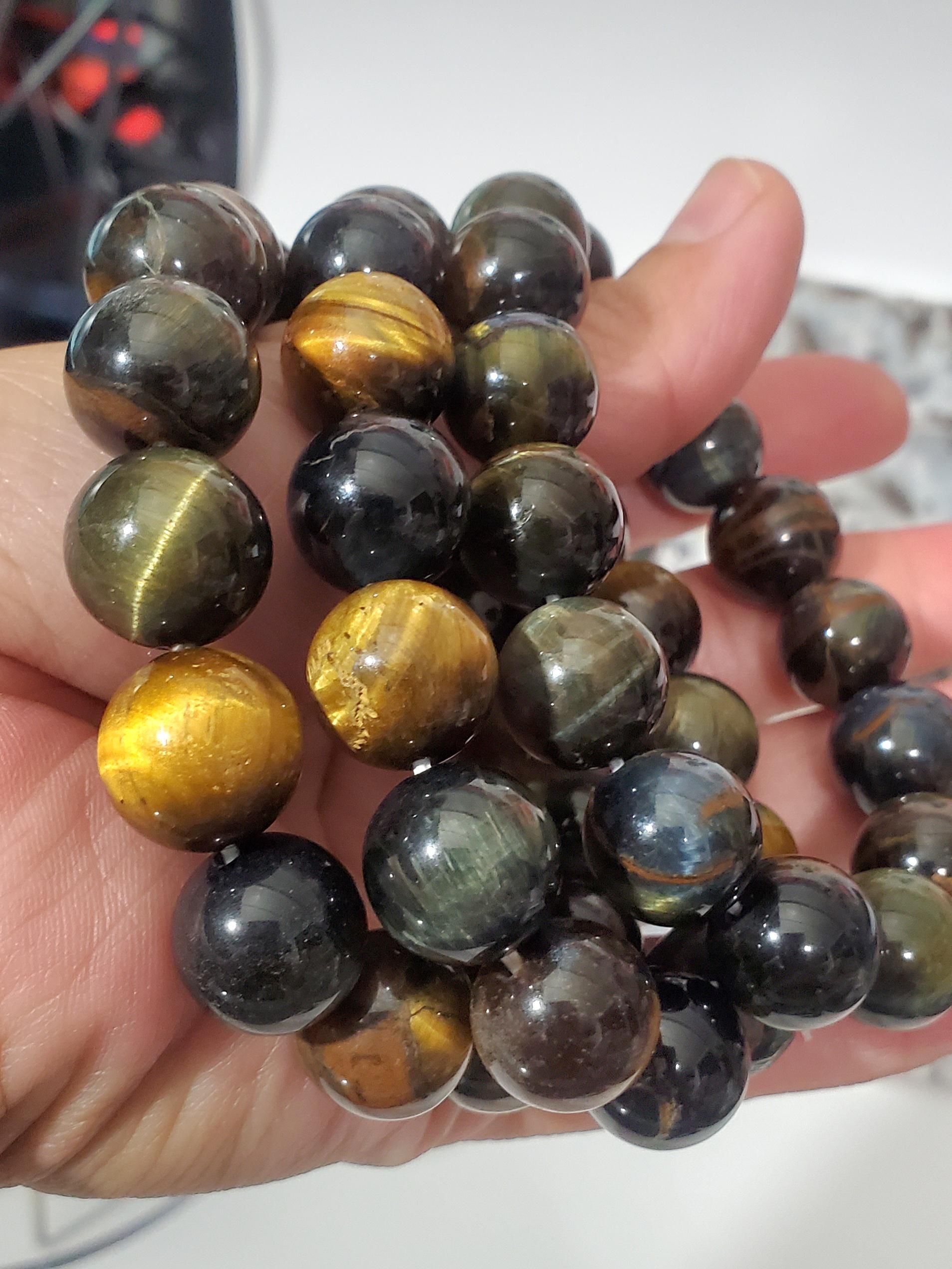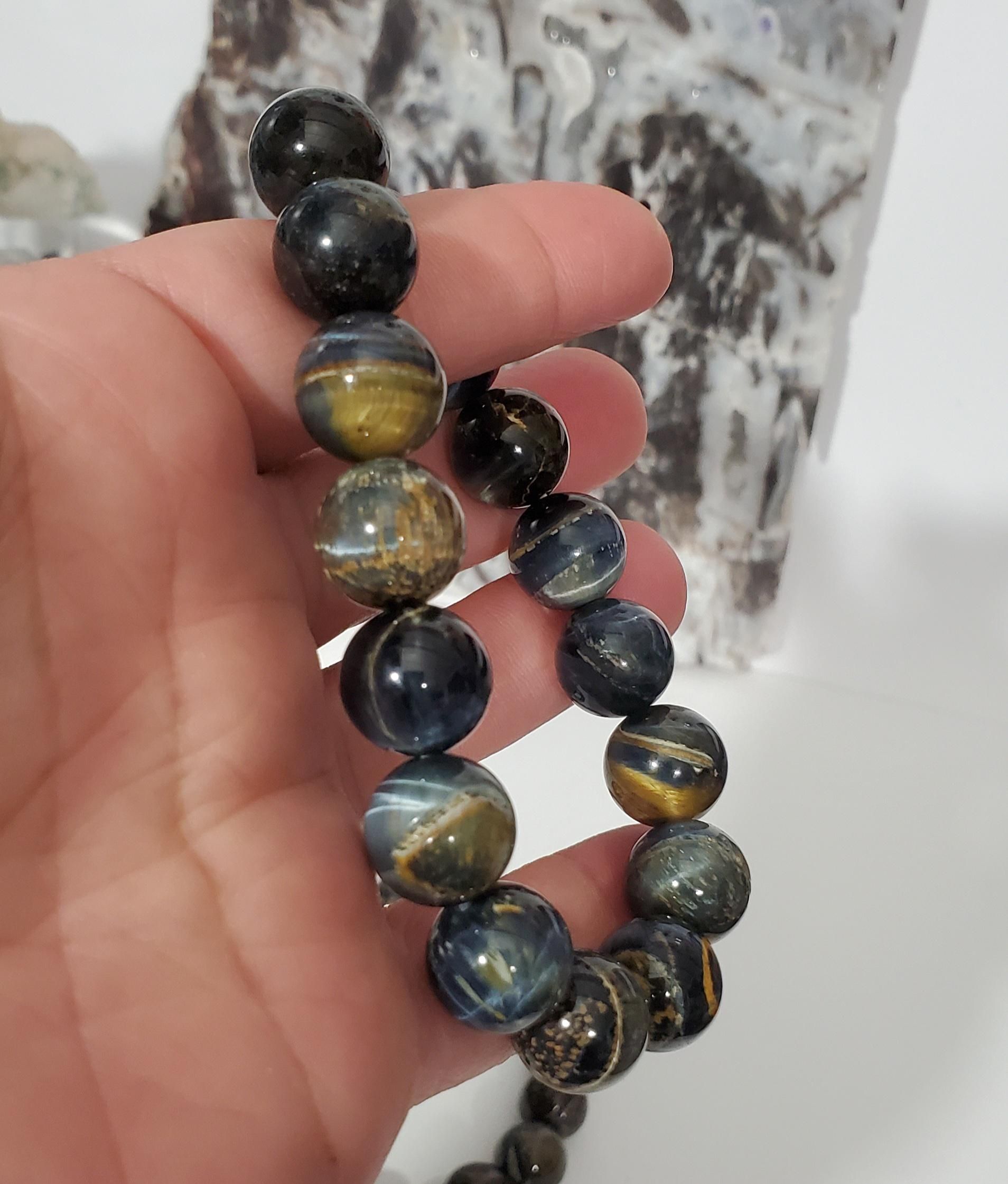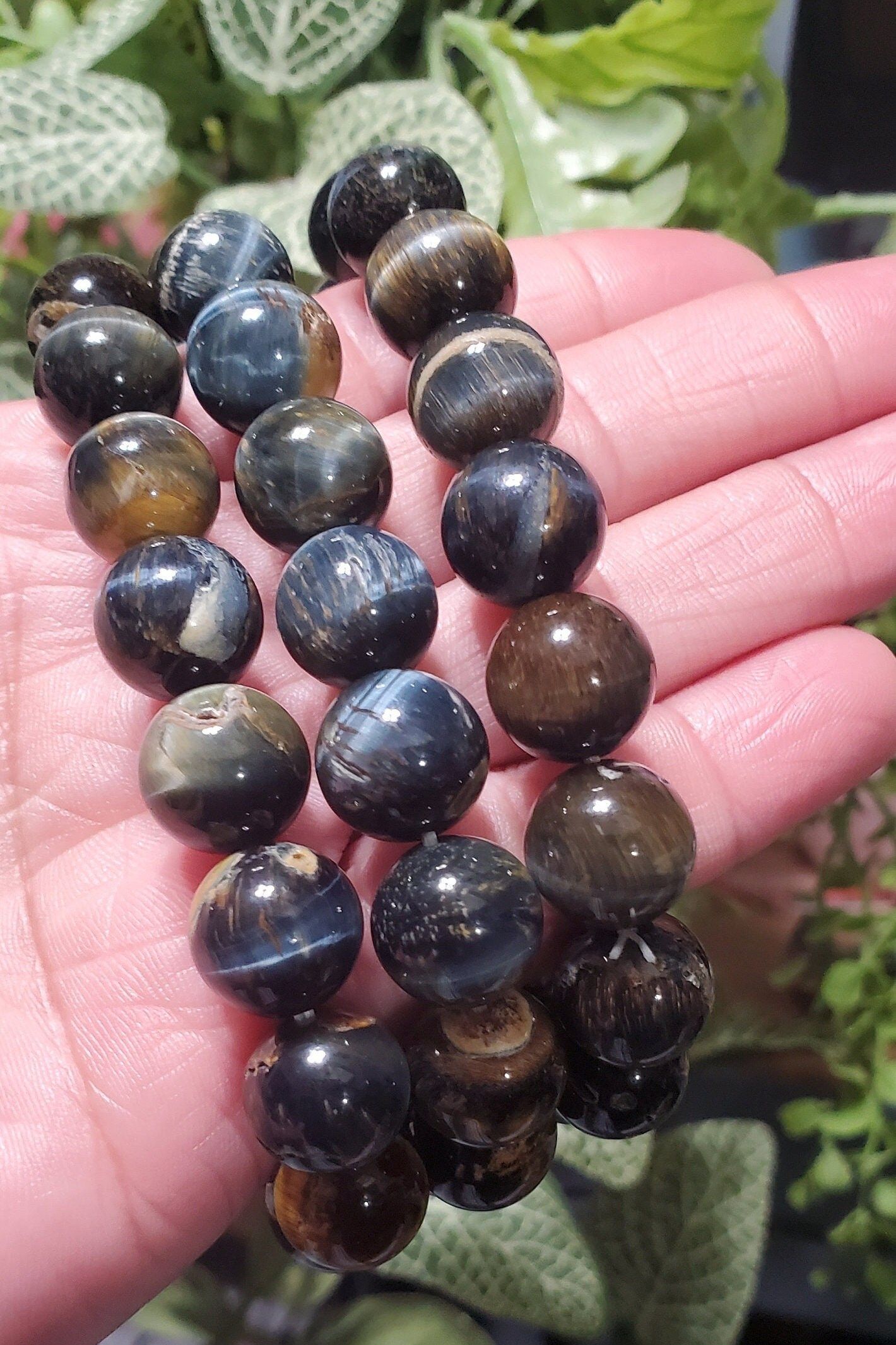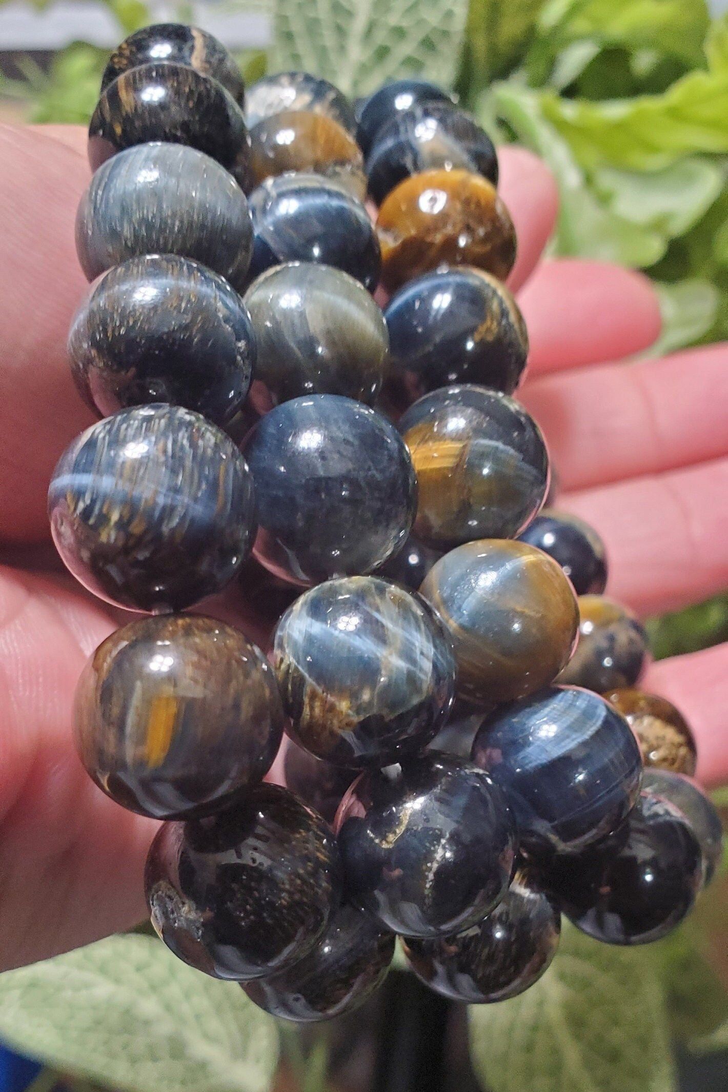 The golden Tiger’s Eye glows with rich amber and honey tones, symbolizing strength, courage, and focus, while the blue Tiger’s Eye (also called Hawk’s Eye) adds deep shades of midnight blue and steel gray, associated with calm insight, protection, and emotional balance. Together, they create a powerful harmony—balancing fiery motivation with cool mindfulness.