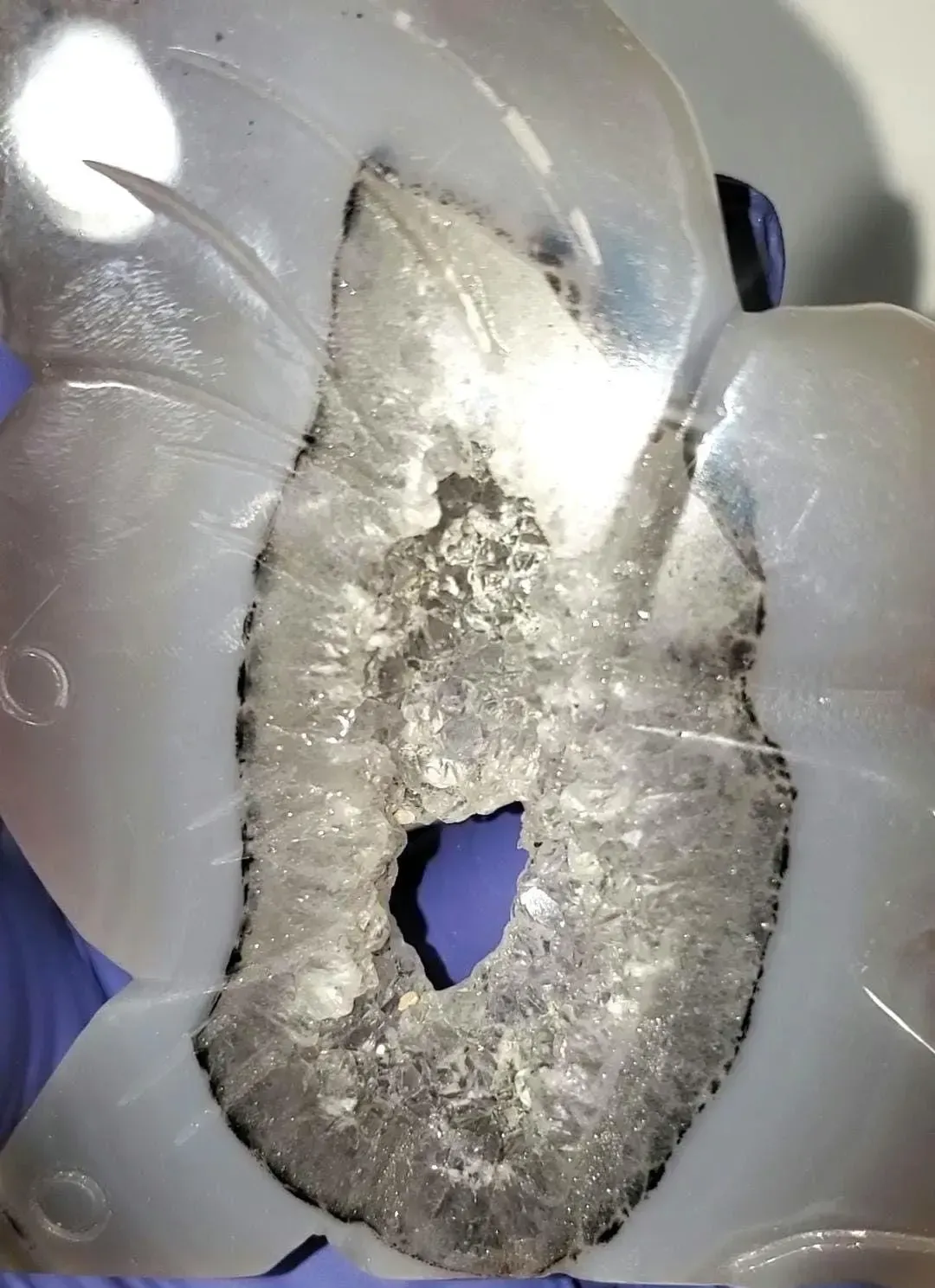 The central cavity lined with sparkling crystals is a druzy formation, where tiny crystals (often quartz) have grown on the surface of another mineral within a geode. Has tree-like or fern-like patterns called dendritic