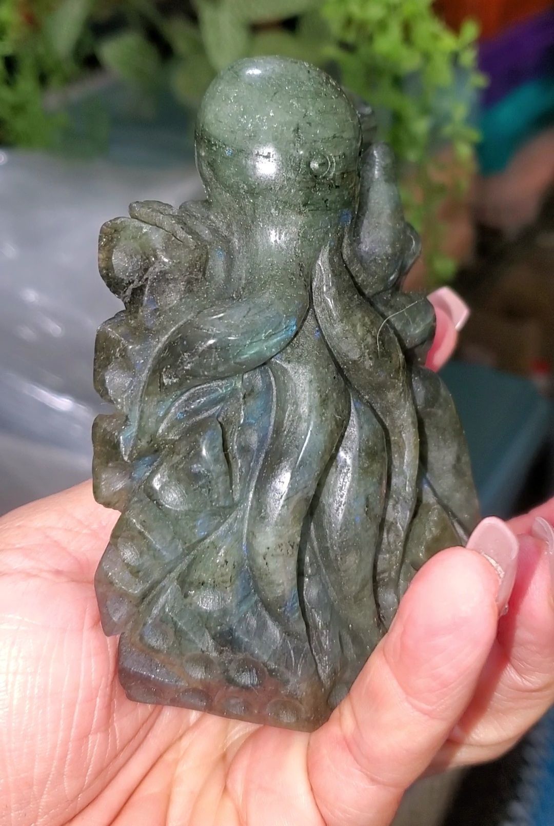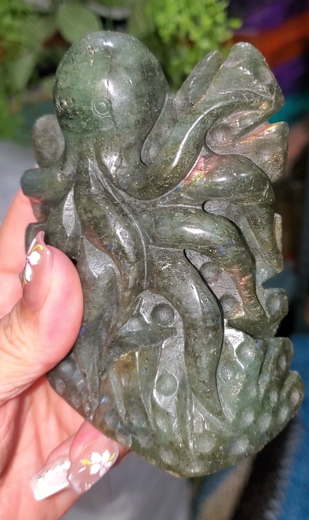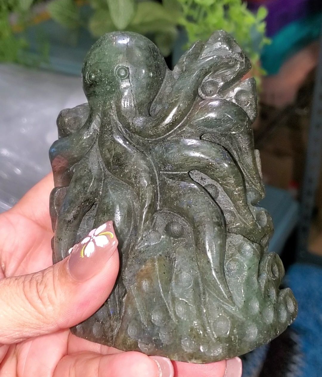 This labradorite octopus is a truly eye-catching piece, featuring stunning flashes of blue, green, and gold that shift in the light. Carefully carved from natural labradorite, it combines the stone’s natural beauty with the octopus’s symbolism of intelligence, adaptability, and mystery. Labradorite is often associated with creativity, intuition, and transformation, making this piece not only decorative but meaningful as well. Perfect for crystal collectors, ocean lovers, or anyone who appreciates unique, handcrafted items, this labradorite octopus makes a striking display piece or a thoughtful gift.