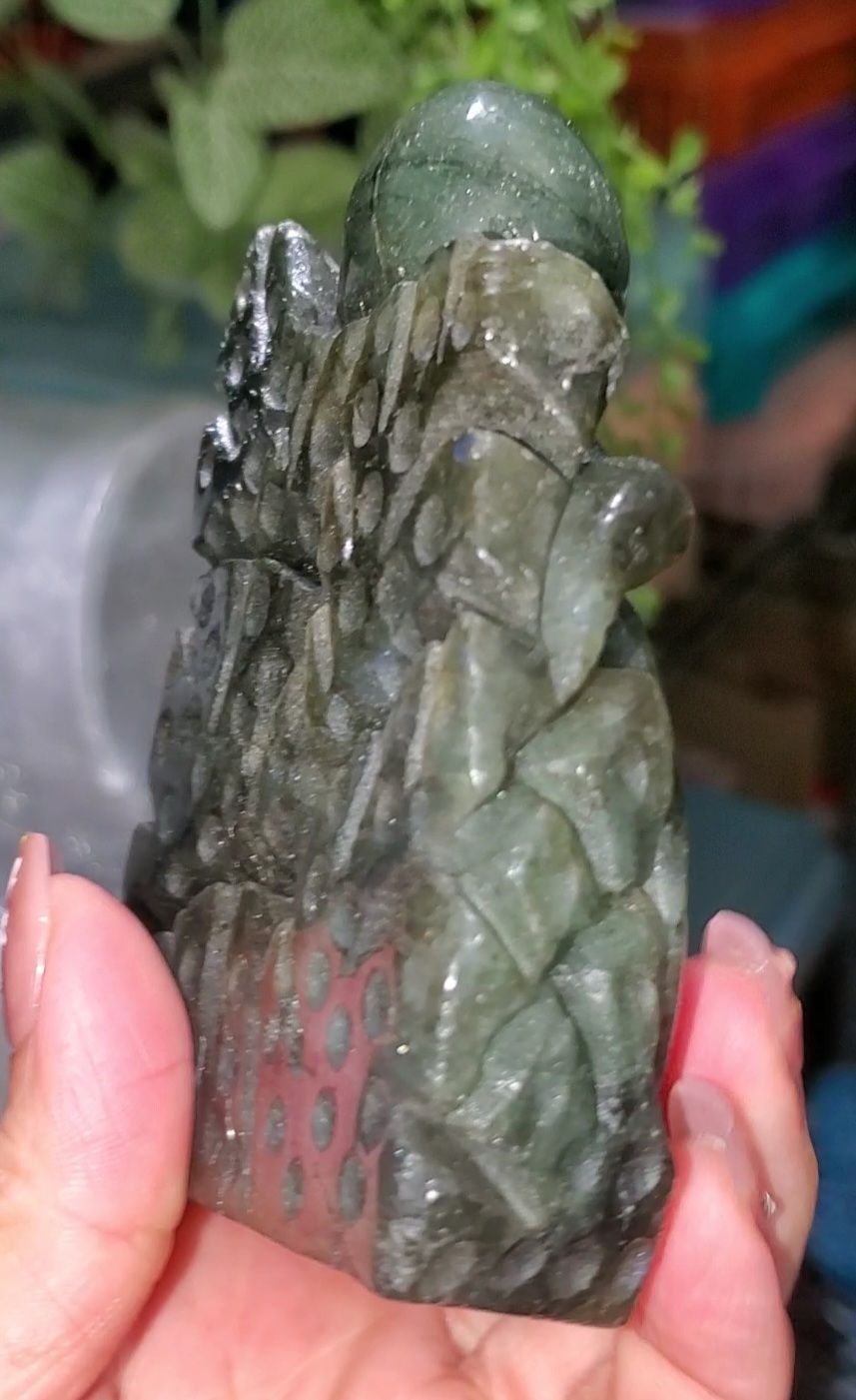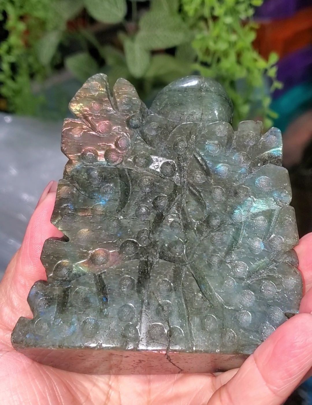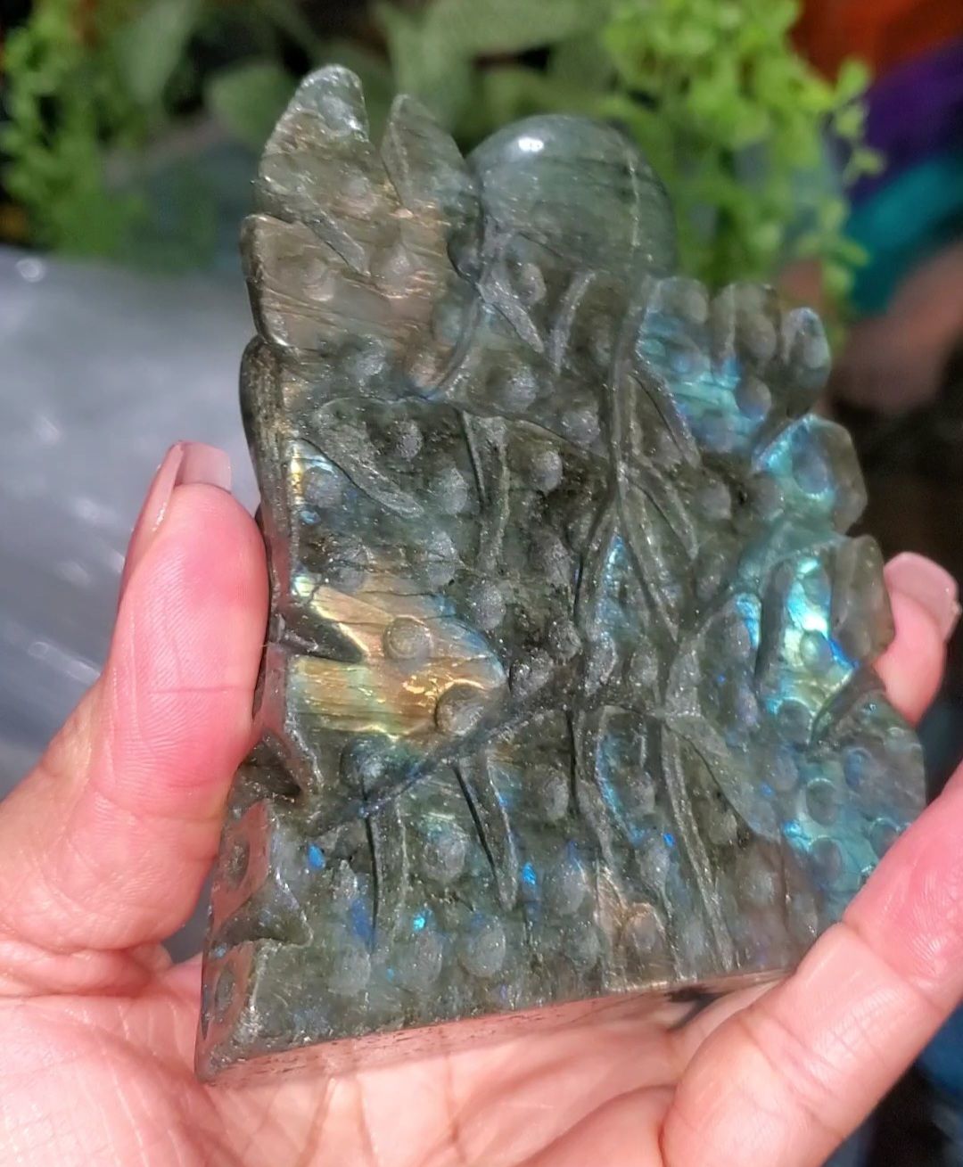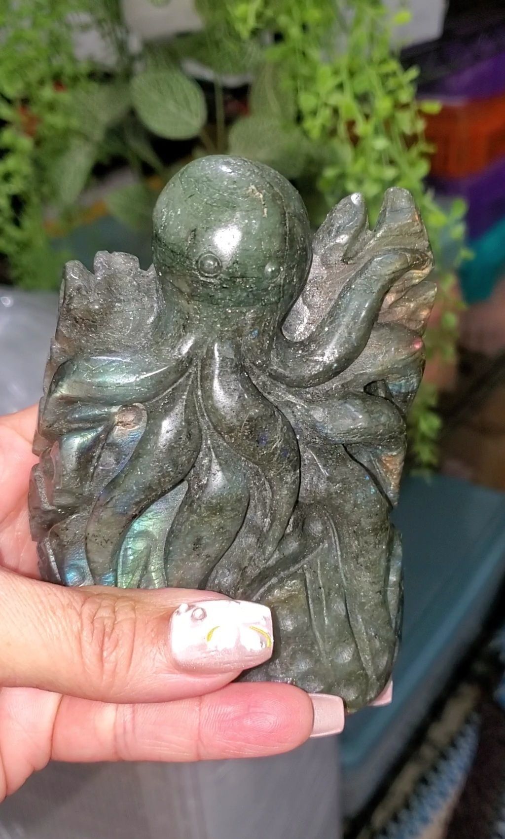 This labradorite octopus is a truly eye-catching piece, featuring stunning flashes of blue, green, and gold that shift in the light. Carefully carved from natural labradorite, it combines the stone’s natural beauty with the octopus’s symbolism of intelligence, adaptability, and mystery. Labradorite is often associated with creativity, intuition, and transformation, making this piece not only decorative but meaningful as well. Perfect for crystal collectors, ocean lovers, or anyone who appreciates unique, handcrafted items, this labradorite octopus makes a striking display piece or a thoughtful gift.