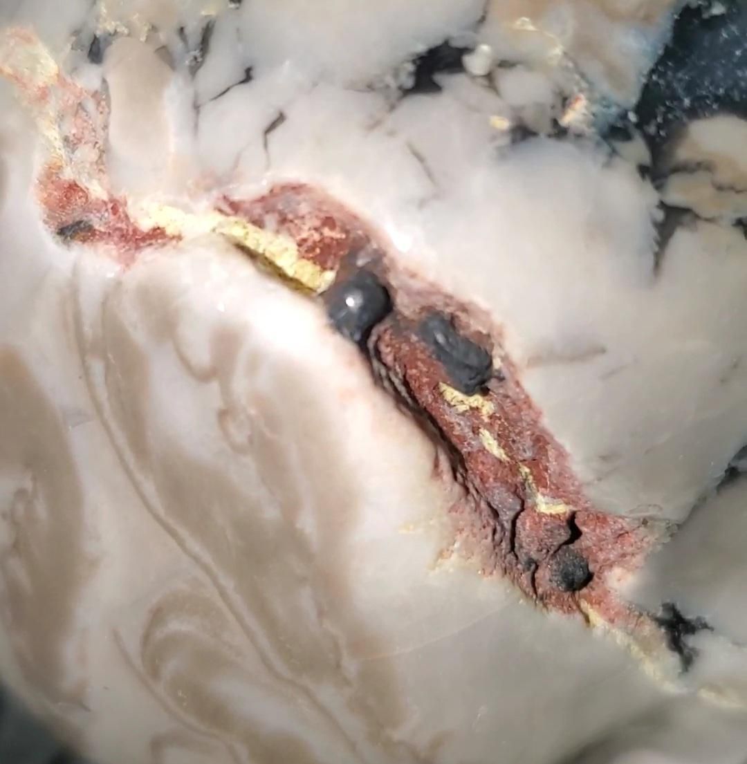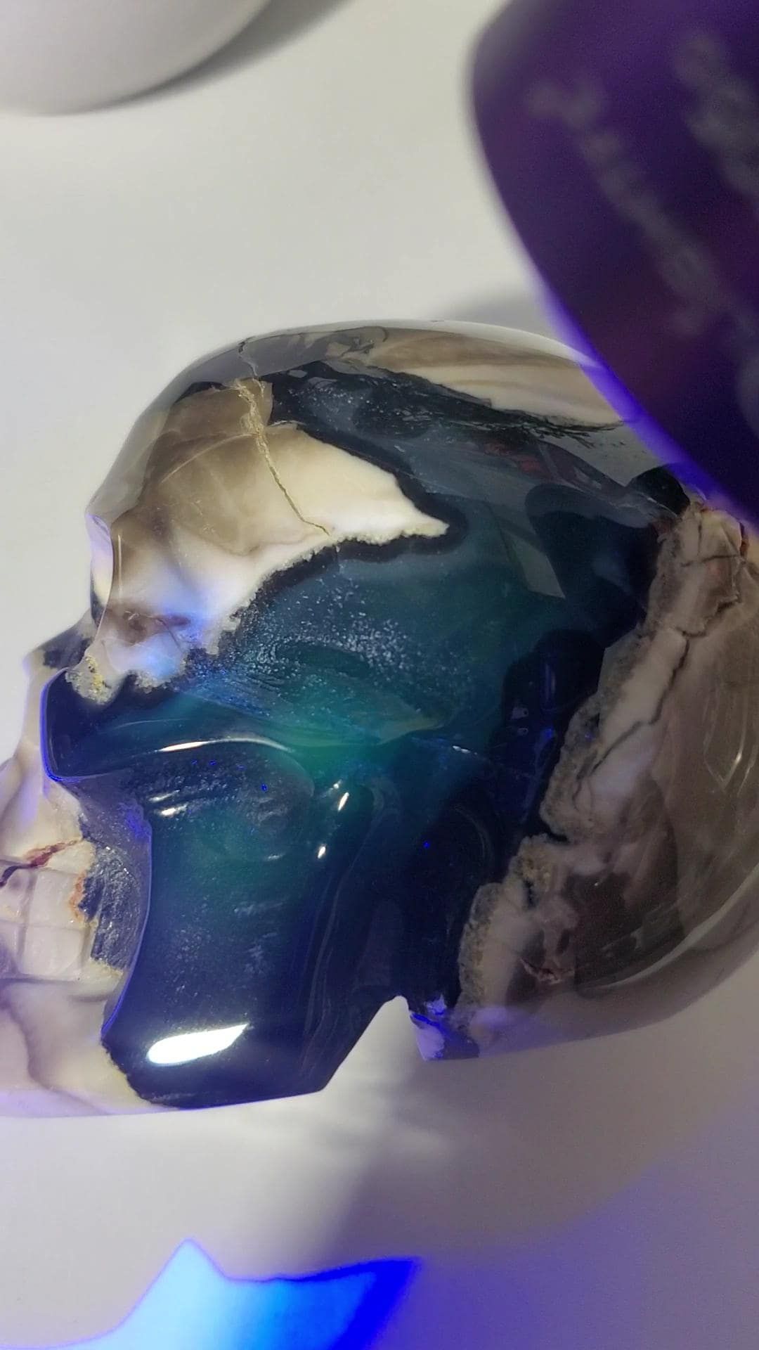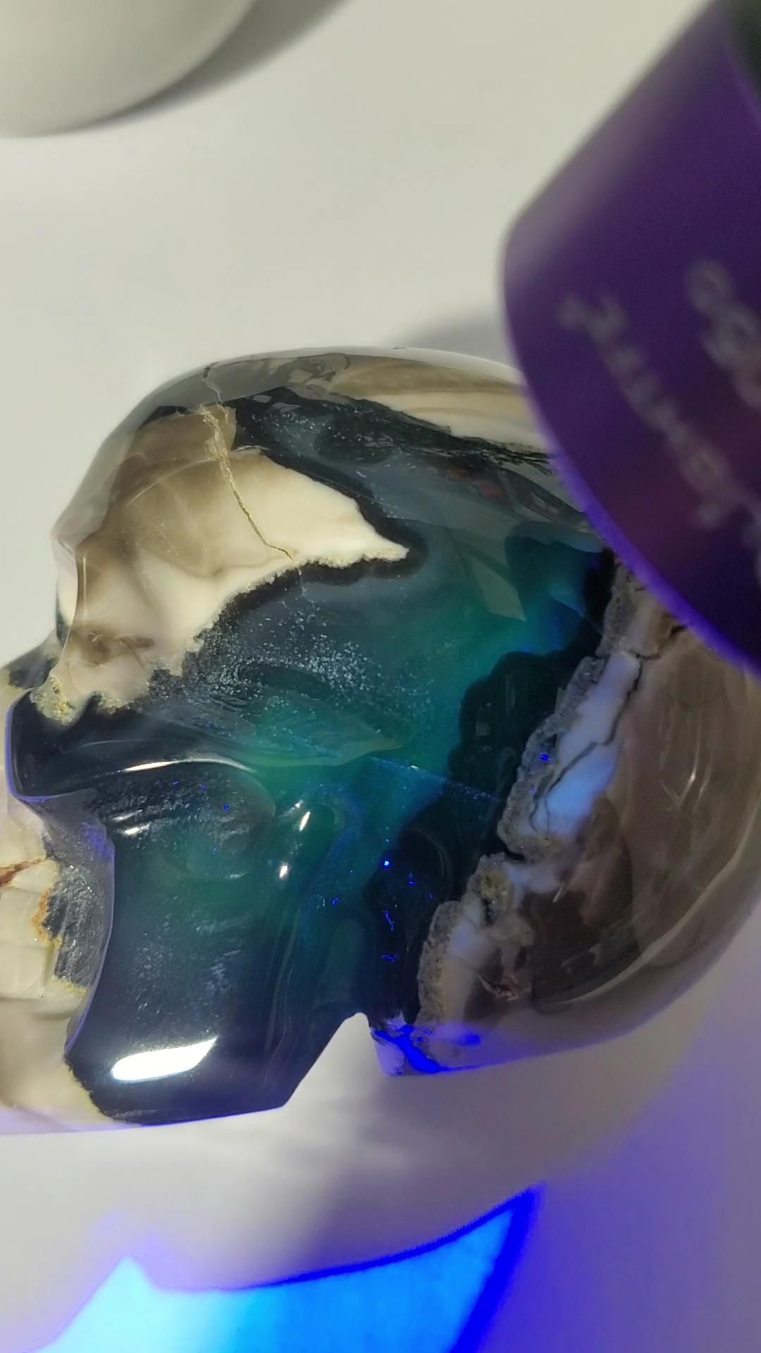 Volcano agate is a striking and dynamic form of agate known for its fiery patterns and vibrant energy, often resembling molten lava or volcanic landscapes. It typically displays a mix of deep reds, oranges, blacks, grays, and occasional hints of white or yellow, created by mineral impurities and volcanic processes during its formation. One of its most captivating features is its UV reactivity—under ultraviolet light, volcano agate can glow vivid green and sometimes bright orange, adding a mesmerizing, almost otherworldly quality to the stone. Like other agates, it is a type of chalcedony, prized for its durability and intricate banding. Metaphysically, volcano agate is associated with transformation, strength, and emotional release, symbolizing the fiery power of rebirth. It’s often used to spark creativity, enhance vitality, and promote courage, making it a favorite among collectors, jewelers, and crystal enthusiasts alike.