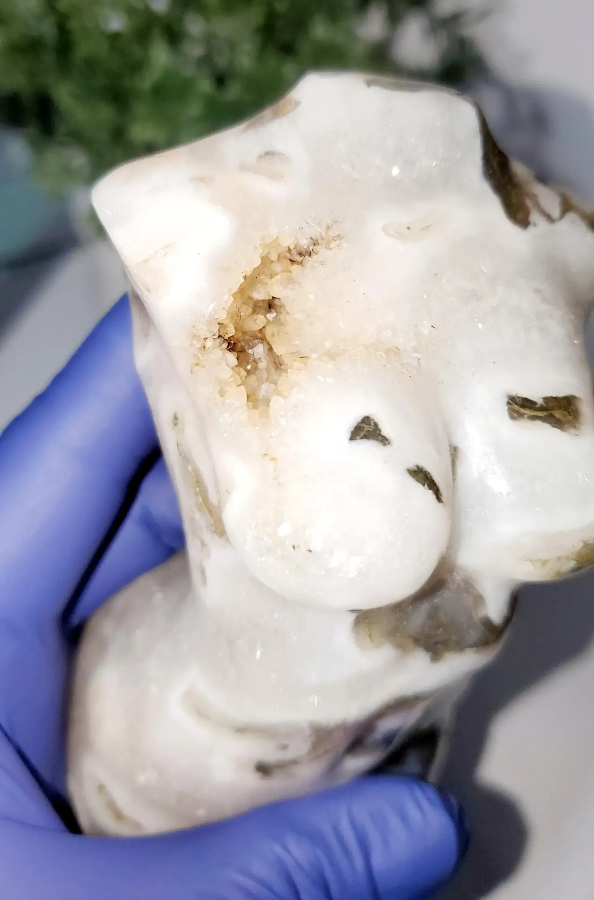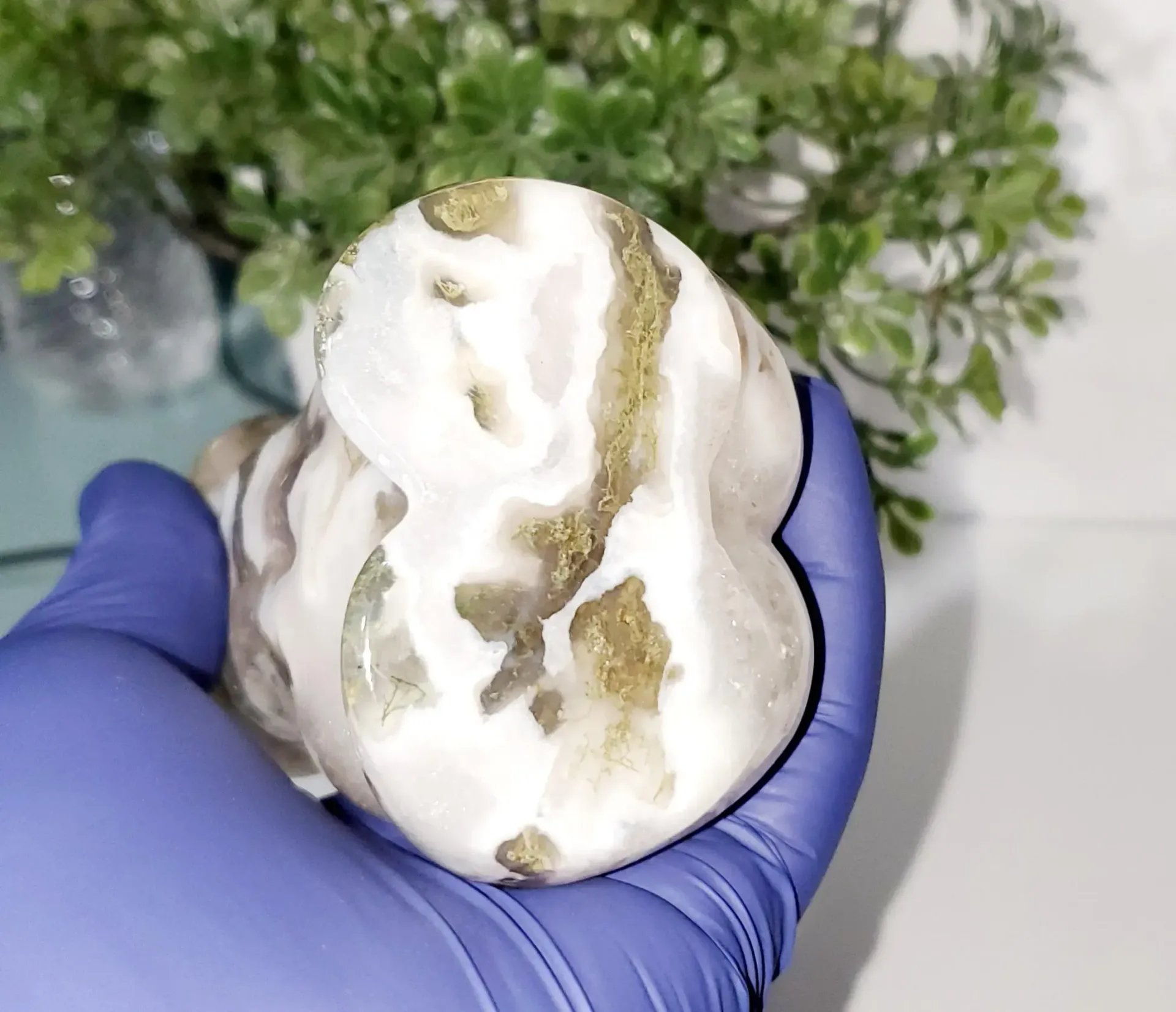 White moss agate is a type of chalcedony (microcrystalline quartz) known for its translucent to milky white base, often interlaced with green, gray, or brown inclusions that resemble moss, plants, or delicate veining. Unlike true moss, these patterns are formed by mineral deposits such as chlorite, hornblende, or other trace minerals trapped inside the quartz as it formed. White moss agate is valued both for its subtle, natural beauty and for its metaphysical associations: it’s often considered a stone of balance, growth, and emotional healing, supporting calmness, clarity, and connection to nature. It is popular in jewelry, especially bead bracelets, pendants, and cabochons, and its soft, earthy appearance makes it versatile for both everyday wear and meditation or energy work.