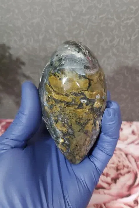 Ocean jasper is a unique and visually striking variety of chalcedony found only along the remote shores of Madagascar. Known for its vibrant, orb-like patterns and swirling colors—ranging from greens and blues to pinks, yellows, and whites—it often displays intricate banding, “eyes,” and translucent pockets that make each piece one of a kind. This stone formed through volcanic processes and was originally accessible only at low tide, adding to its rarity and allure. Many people value ocean jasper not only for its beauty but also for its associations with calming, uplifting energy and its reputation as a stone that encourages joy, patience, and emotional balance