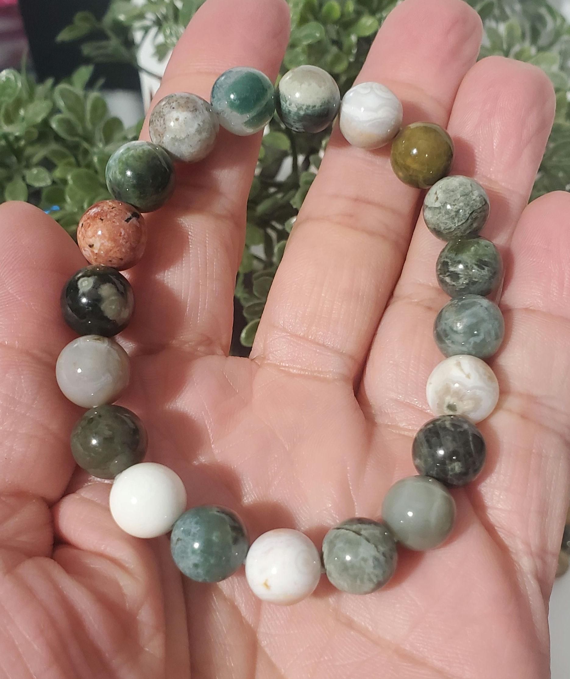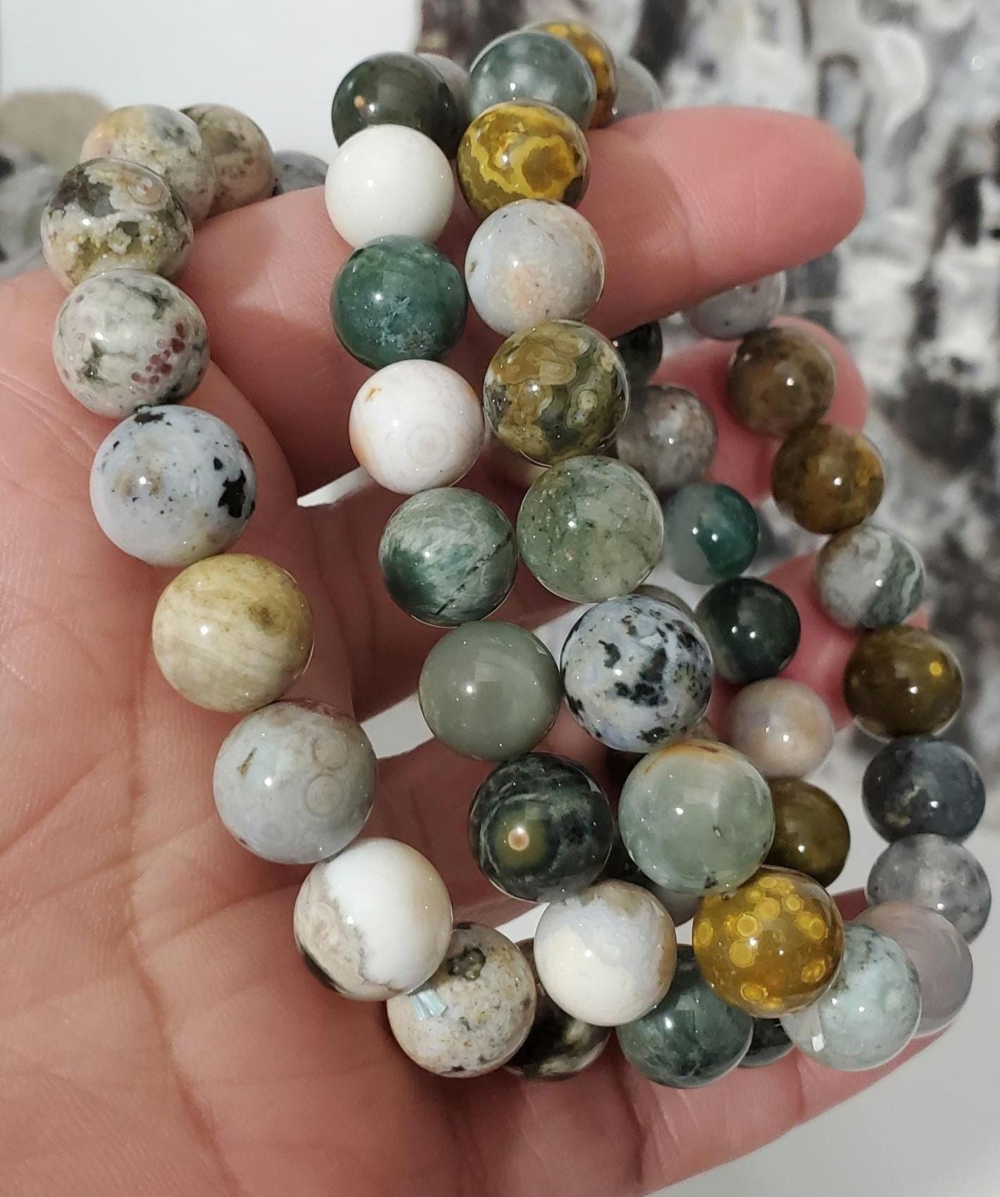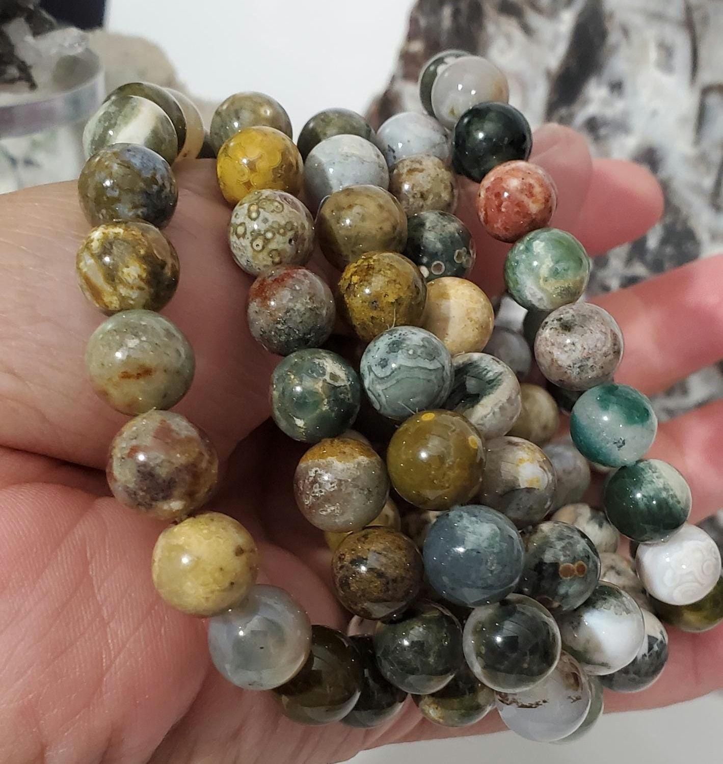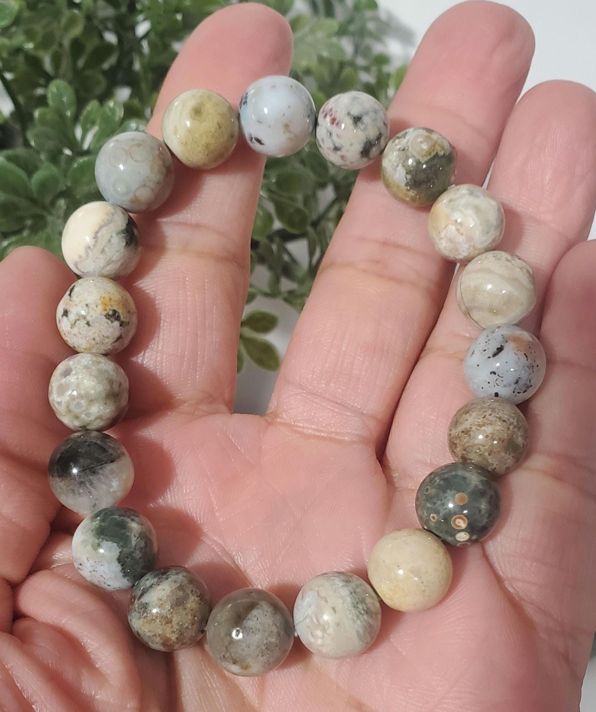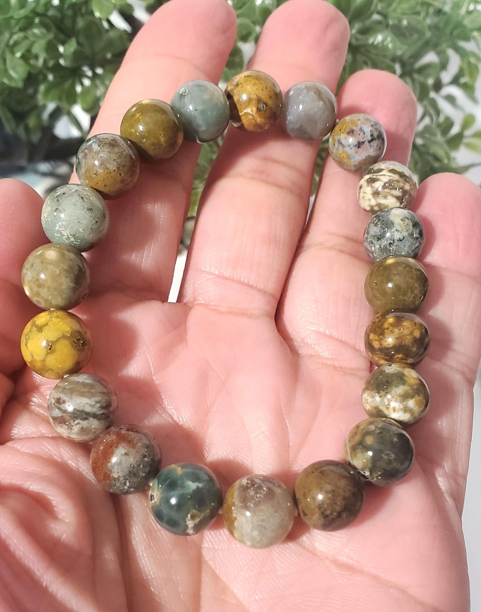 Ocean jasper bead bracelets are stretchy or corded bracelets made from round beads of ocean jasper, a colorful and patterned stone found only in Madagascar. Each bead is naturally unique, often showing orbs, swirls, banding, or soft ocean-like colors in greens, pinks, creams, yellows, and browns. These bracelets are loved both for their soothing, earthy aesthetic and for the calming, joyful energy many people associate with ocean jasper, often called the “Stone of Happiness.” Worn daily, ocean jasper bead bracelets are thought to promote emotional balance, patience, stress relief, and a sense of uplifted well-being, while also making a beautiful, organic accessory that pairs easily with other gemstone bracelets.
