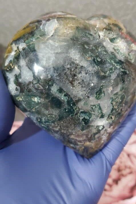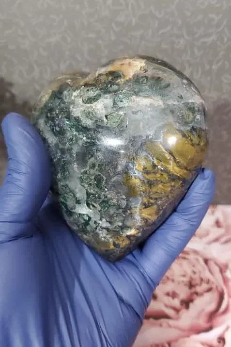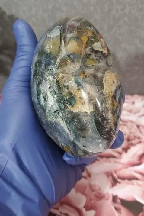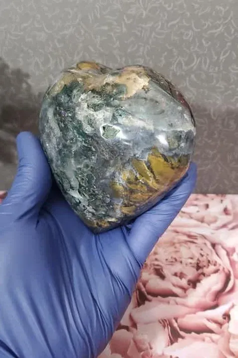An ocean jasper heart is a polished gemstone carved into the shape of a heart, made from the unique and colorful stone known as ocean jasper. Found primarily along the coast of Madagascar, ocean jasper is famous for its orb-like patterns, swirling bands, and vibrant mix of colors—greens, pinks, whites, yellows, and browns—that often resemble the movement of ocean waves. The heart shape enhances the stone’s natural associations with love, compassion, and emotional healing, making it a popular choice for meditation, gifting, or as a decorative piece. Metaphysically, ocean jasper hearts are believed to encourage joy, positivity, and emotional balance, while also nurturing a deep connection to nature and inner peace. Their combination of beauty, symbolism, and soothing energy makes them treasured items for collectors and crystal enthusiasts alike.